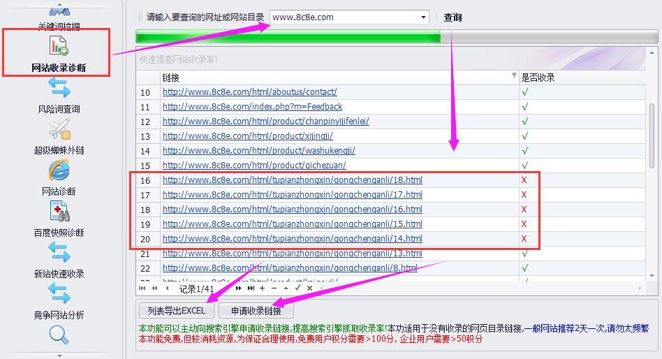 云优化软件有一个功能,可以和百度手动提交搭配使用,就是网站收录诊断,这个功能可以检测网站哪些页面是已经收录的,哪些页面是未收录的。我们可以把链接导出,筛选出未收录的进行提交,提高我们的工作效率。